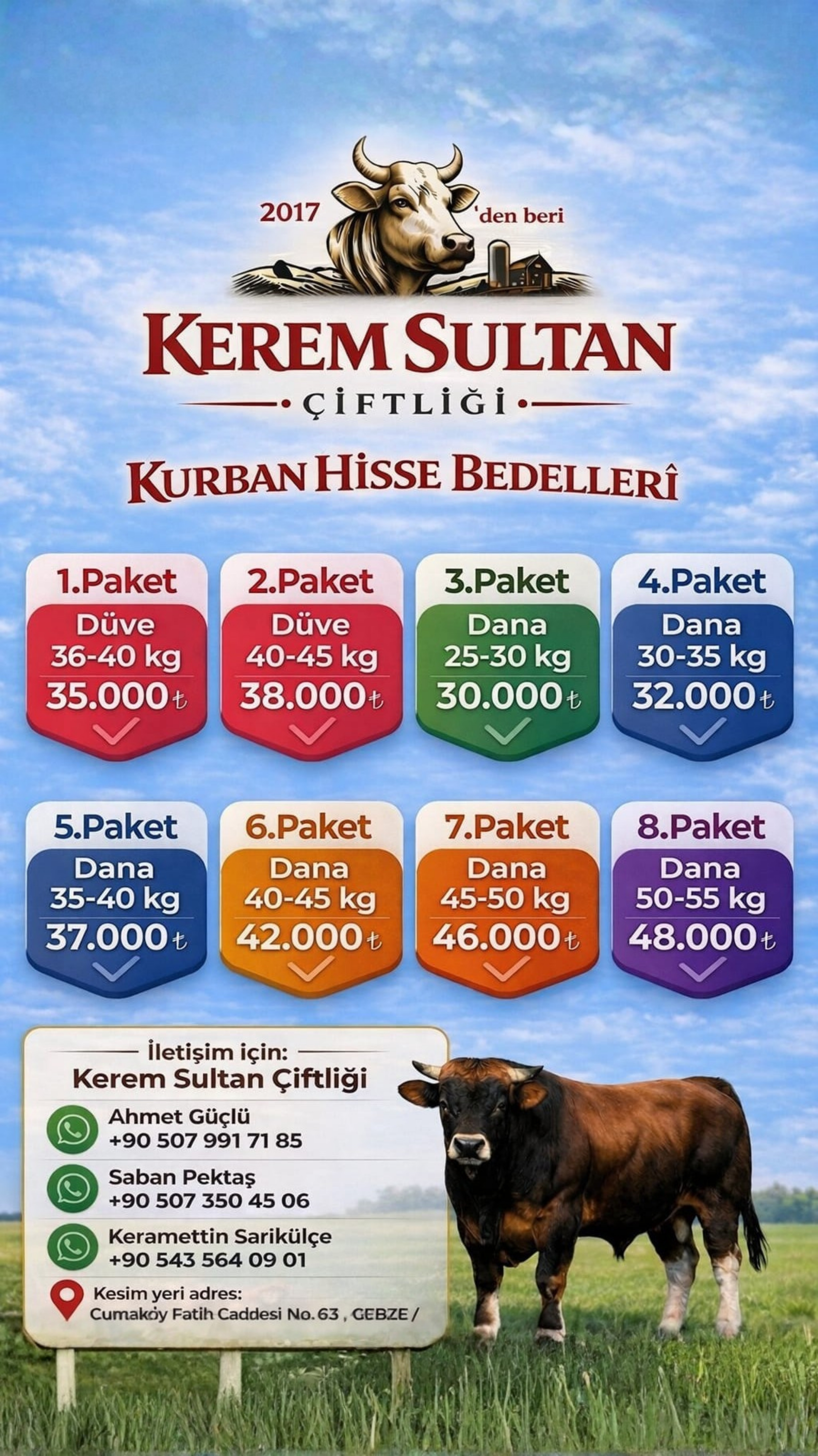 Kerem Sultan Çiftliği olarak, Kurban Bayramınız için en kaliteli ve sağlıklı büyükbaş hayvanlarımızı sunuyoruz. Fiyat broşürümüzde detaylı bilgi edinin. Tek tıkla broşürümüzü aşağıdaki düğmeden görüntüleyebilirsiniz.